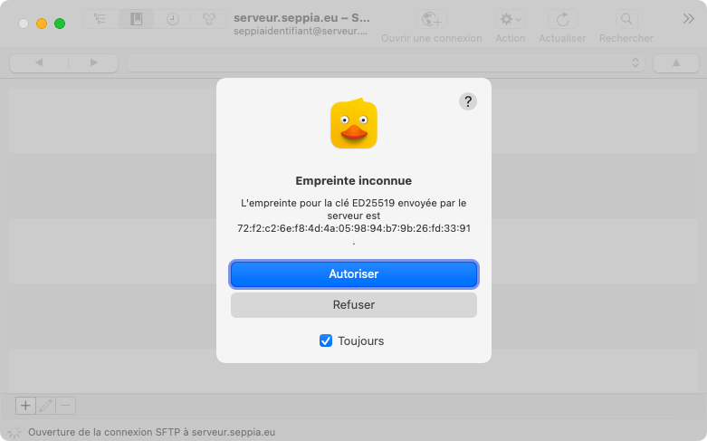 Pour vous connecter au serveur SFTP de Seppia, nous vous recommandons de télécharger, d’installer et d’utiliser un logiciel client SFTP dédié, par exemple Cyberduck ou FileZilla.