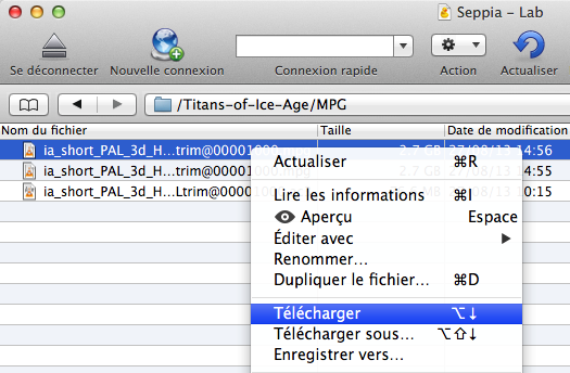 Pour recevoir (download) un fichier depuis le serveur de Seppia vers votre ordinateur : utilisez la fonction « Télécharger » (en effectuant un clic droit sur le fichier à télécharger) :