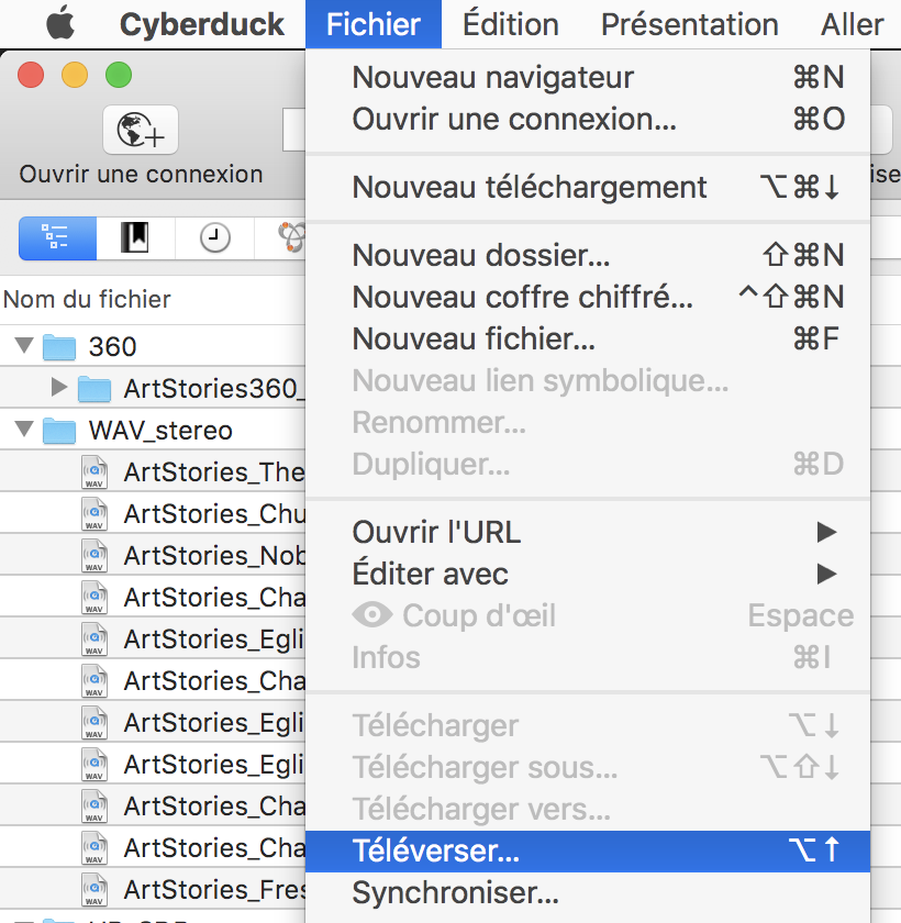 Pour envoyer (upload) un fichier depuis votre ordinateur vers le serveur de Seppia : utilisez la fonction « Téléverser » (accessible par le menu « Fichier« ) :