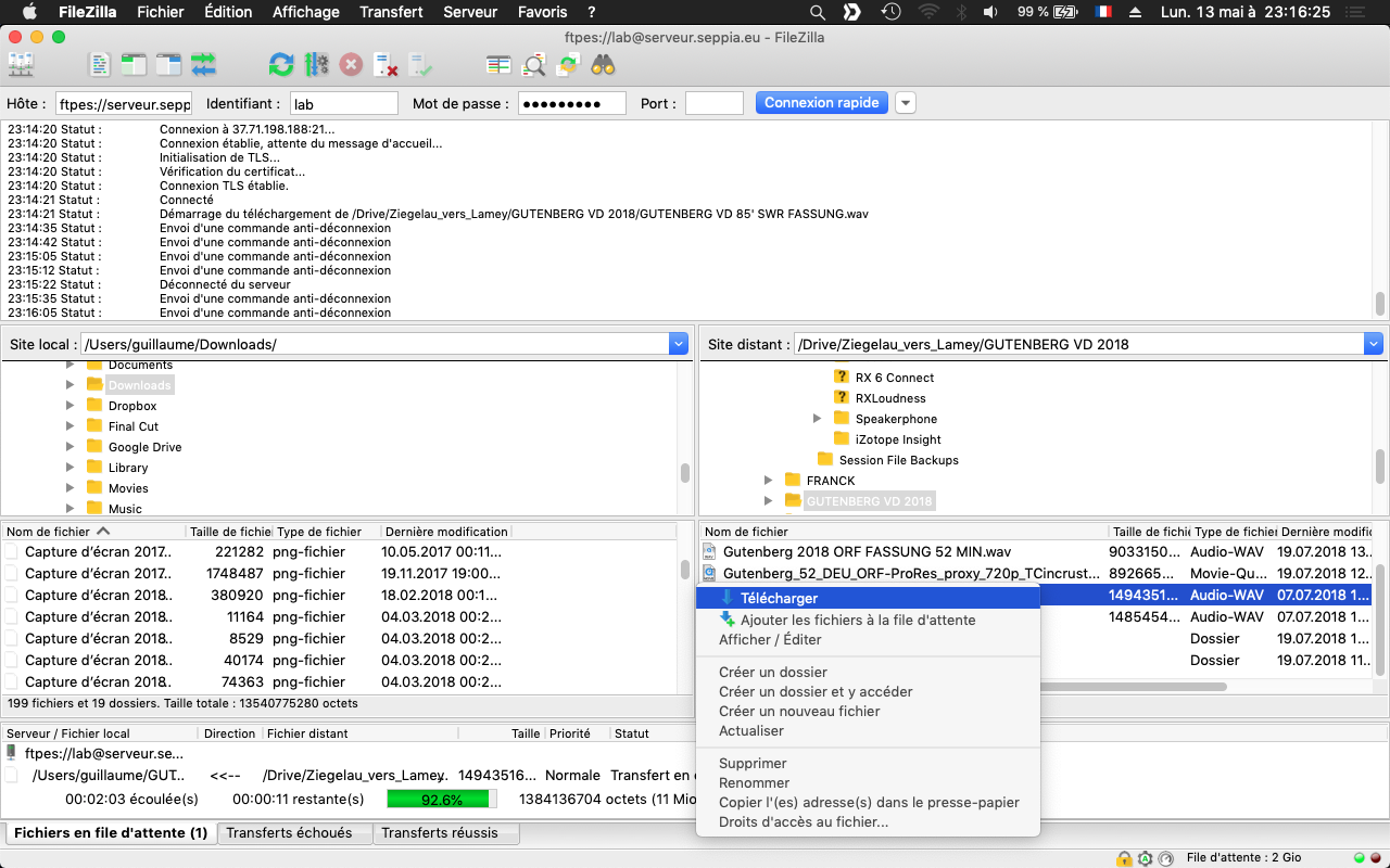 Pour recevoir (download) un fichier depuis le serveur de Seppia vers votre ordinateur : naviguez dans le dossier de réception votre choix dans la partie gauche « Site local » (votre ordinateur). Dans la partie « Site distant » sélectionnez le(s) fichier(s) que vous souhaitez récupérer, puis effectuez un clic droit > Télécharger :