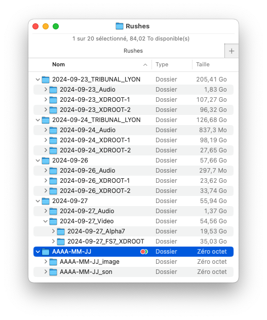 Sur les disques durs externes, les rushes doivent être rangés dans des dossiers nommé à la date du jour de tournage, sous la forme AAAA-MM-JJ.